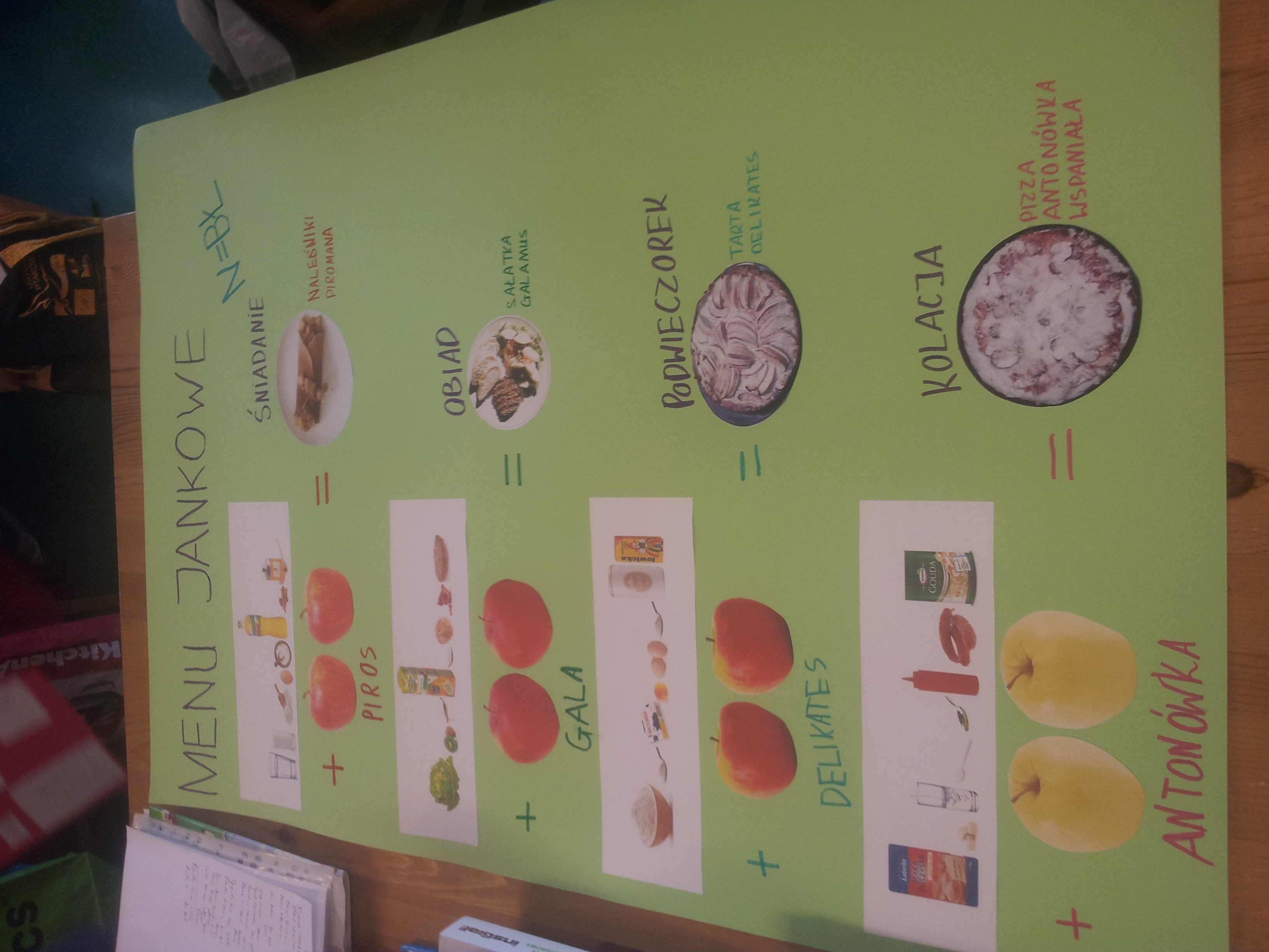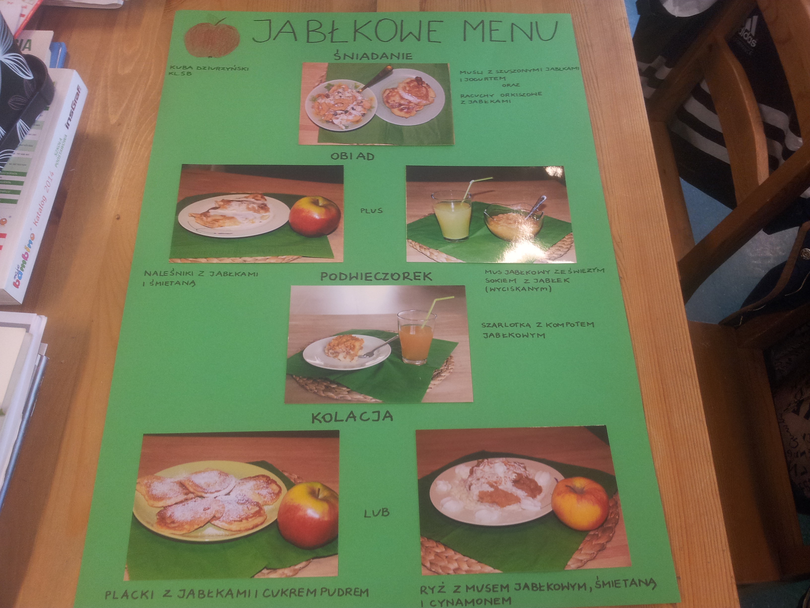 Na Mazowszu od czasów królowej Bony jest mnóstwo sadów, których zbiera się zdrowe, polskie jabłka. Okolice Grójca, Góry Kalwarii słyną z produkcji eksportowych jabłek. Ale w Polsce też warto jeść jabłka! Przygotuj menu jabłkowe na cały dzień. Jak wykorzystać jabłko do śniadania, obiadu, kolacji, na podwieczorek. Przygotuj potrawy jabłkowe i zrób zdjęcia całodziennego menu jabłkowego. Możesz nadać smakowite nazwy potrawom jabłkowym. Menu zafoliuj dokładnie.