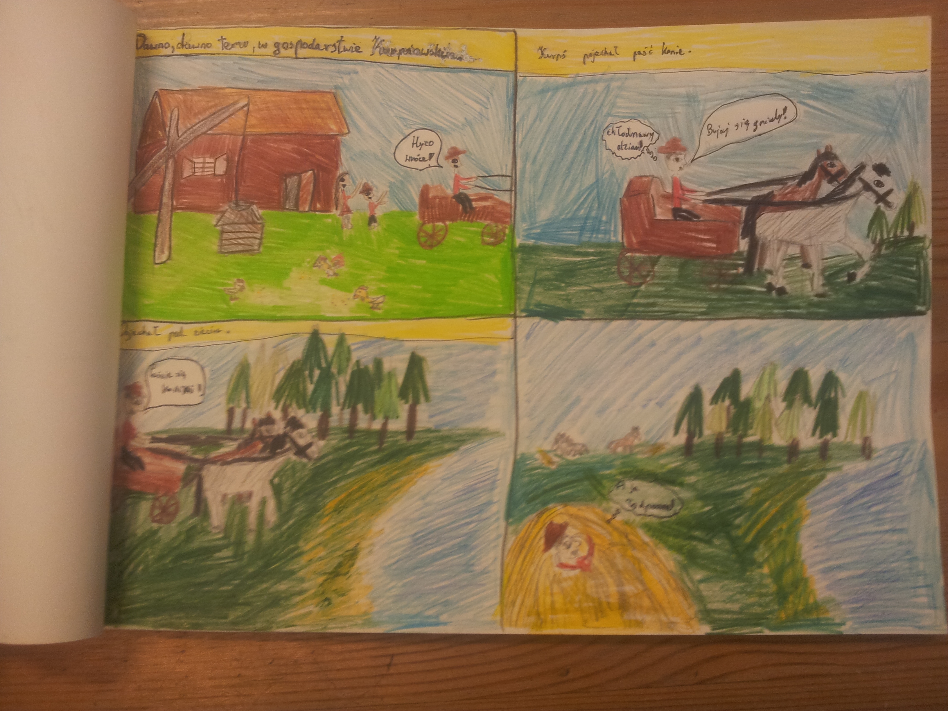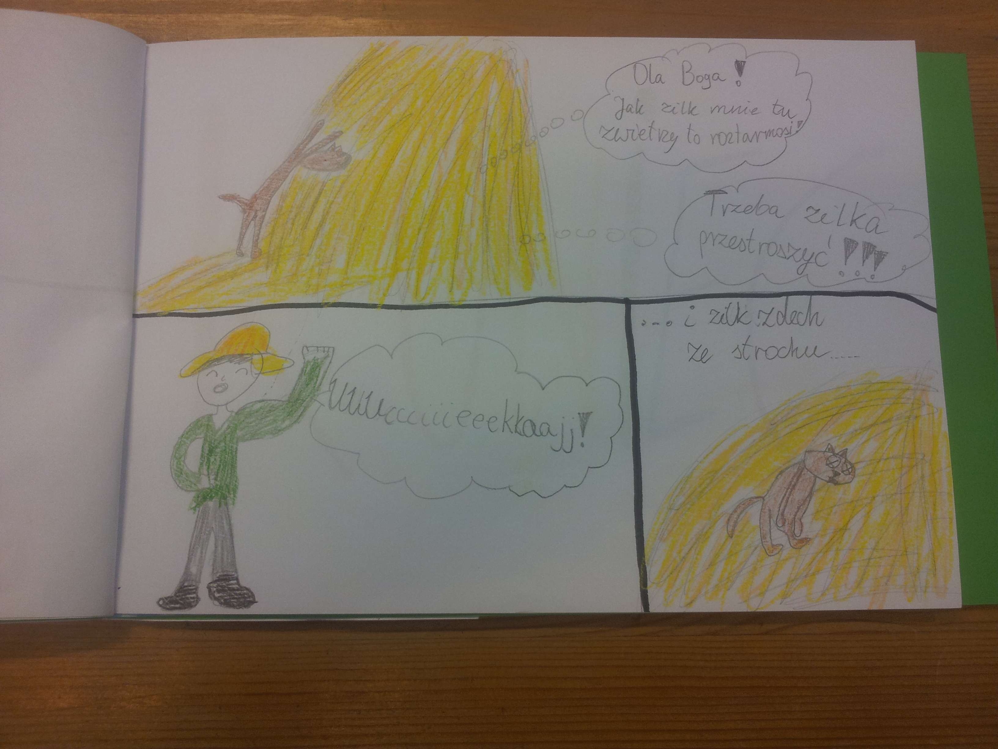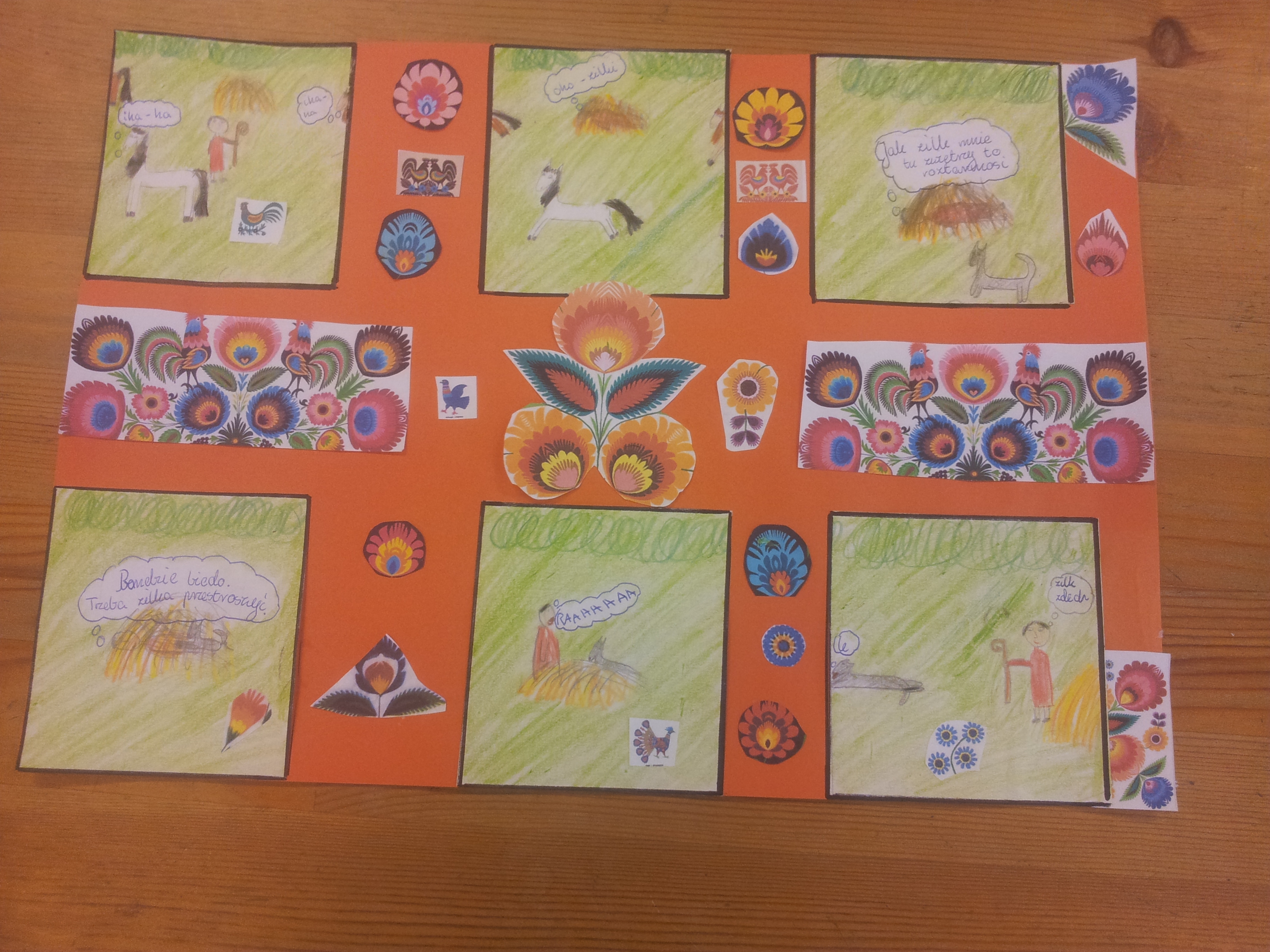 Kurpie to region, gdzie spotkać się można nie tylko z ciekawymi wzorami ludowymi, ale także z gwarą kurpiowską. Narysuj komiks ilustrujący kurpiowskie opowiadanie (w załączniku, na końcu). Wykorzystaj w ilustracjach charakterystyczne motywy kurpiowskie, a w dialogach kurpiowską gwarę. Włóż komiks do foliowej koszulki, tak go łatwiej zdezynfekować.