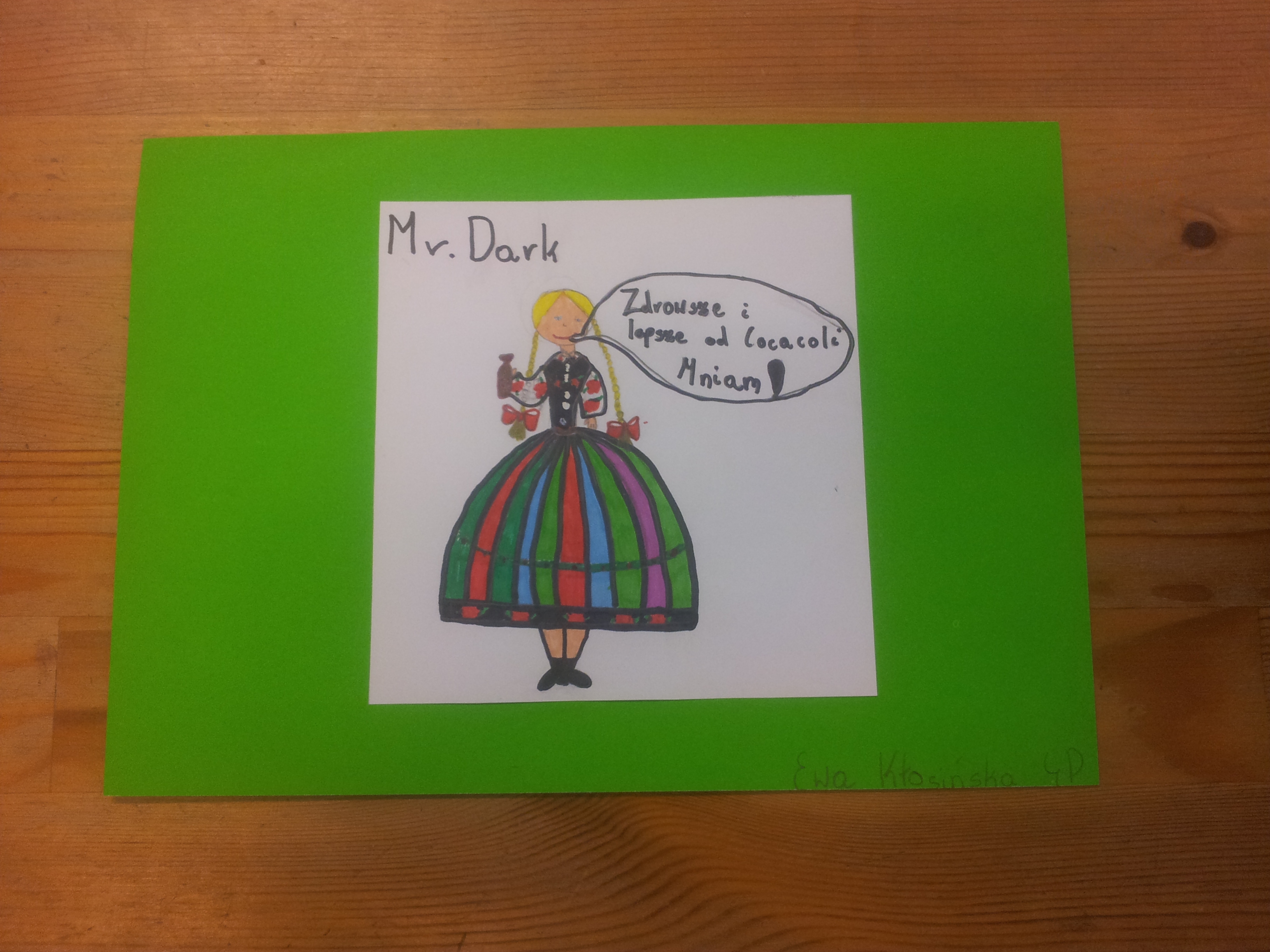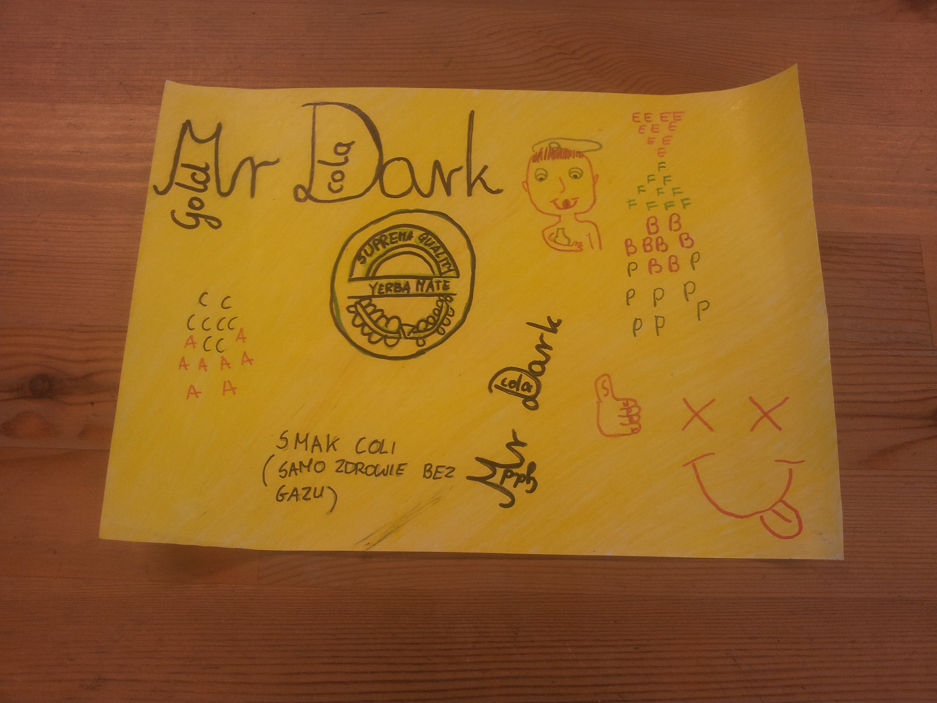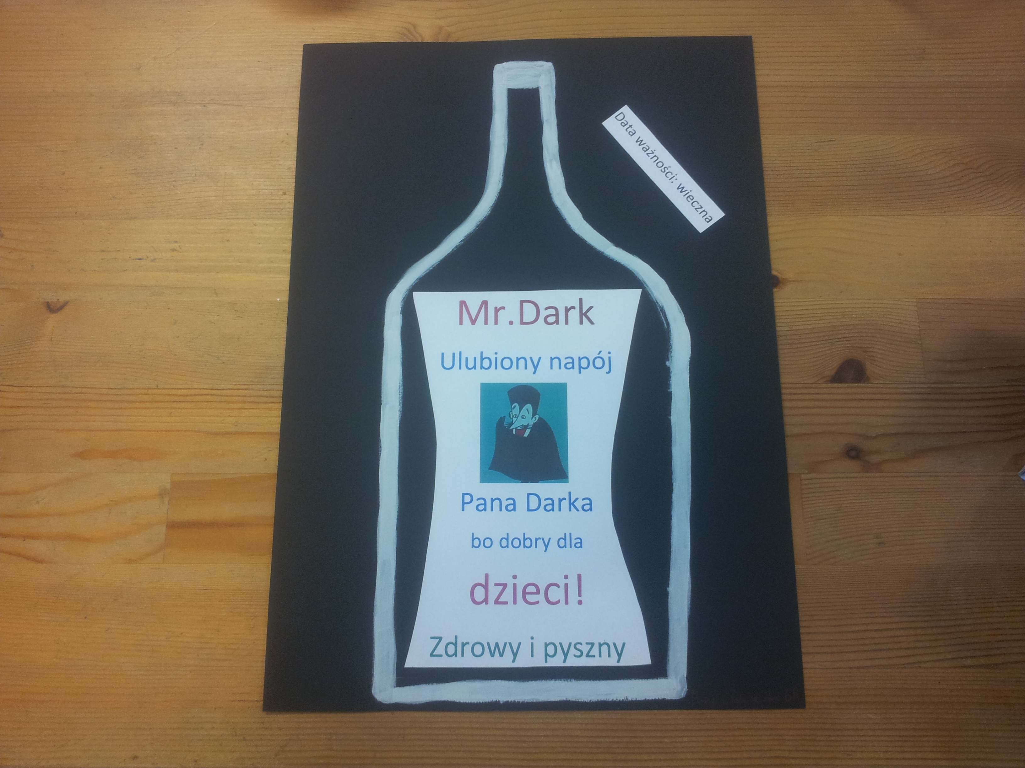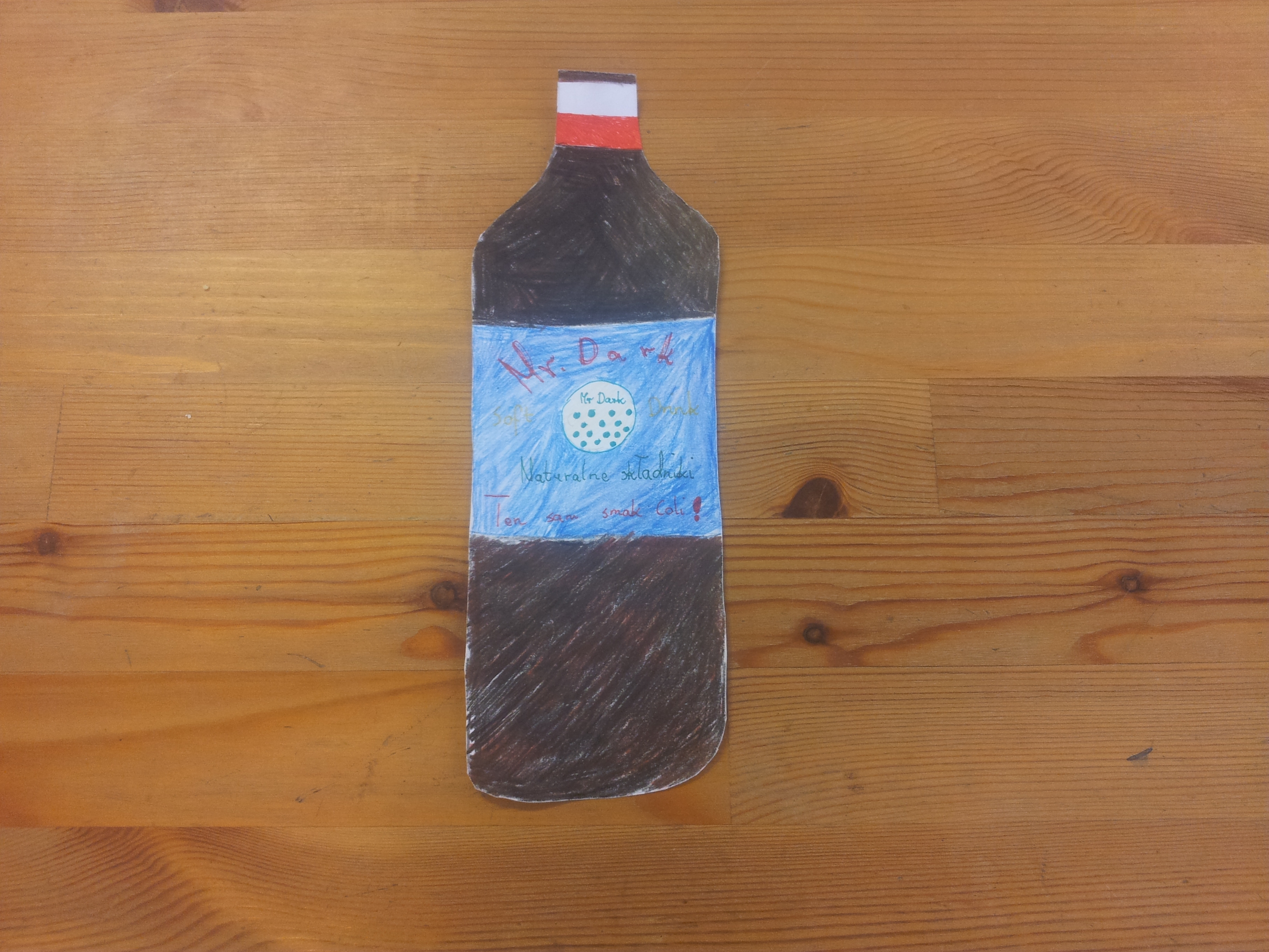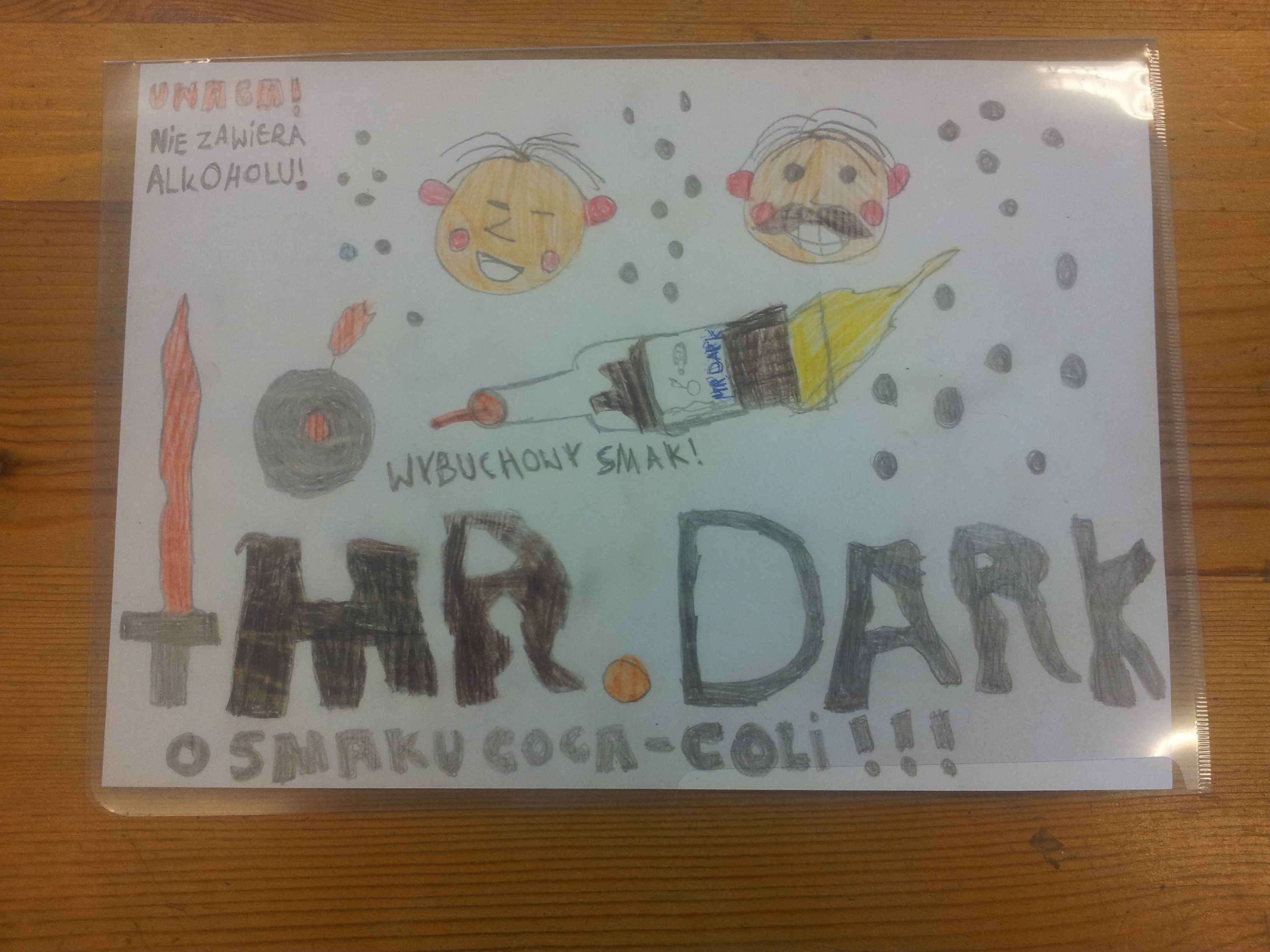 Polskie firmy produkują bardzo fajne rzeczy. Czasem jednak zapatrzeni w zachodnie marki możemy przegapić coś dobrego na naszym rynku. Firma Dan z Szydłowca produkuje napój Mr. Dark, który smakuje jak cola. Dostępna jest wersja biała, czarna, złota i srebrna. Sprawdź na stronie firmy http://dan-napoje.pl Etykiety jednak niekoniecznie sugerują napój dobry dla dzieci. Zaprojektuj lepszą etykietę na butelkę polskiej coli, zachowując nazwę firmową napoju Mr. Dark.