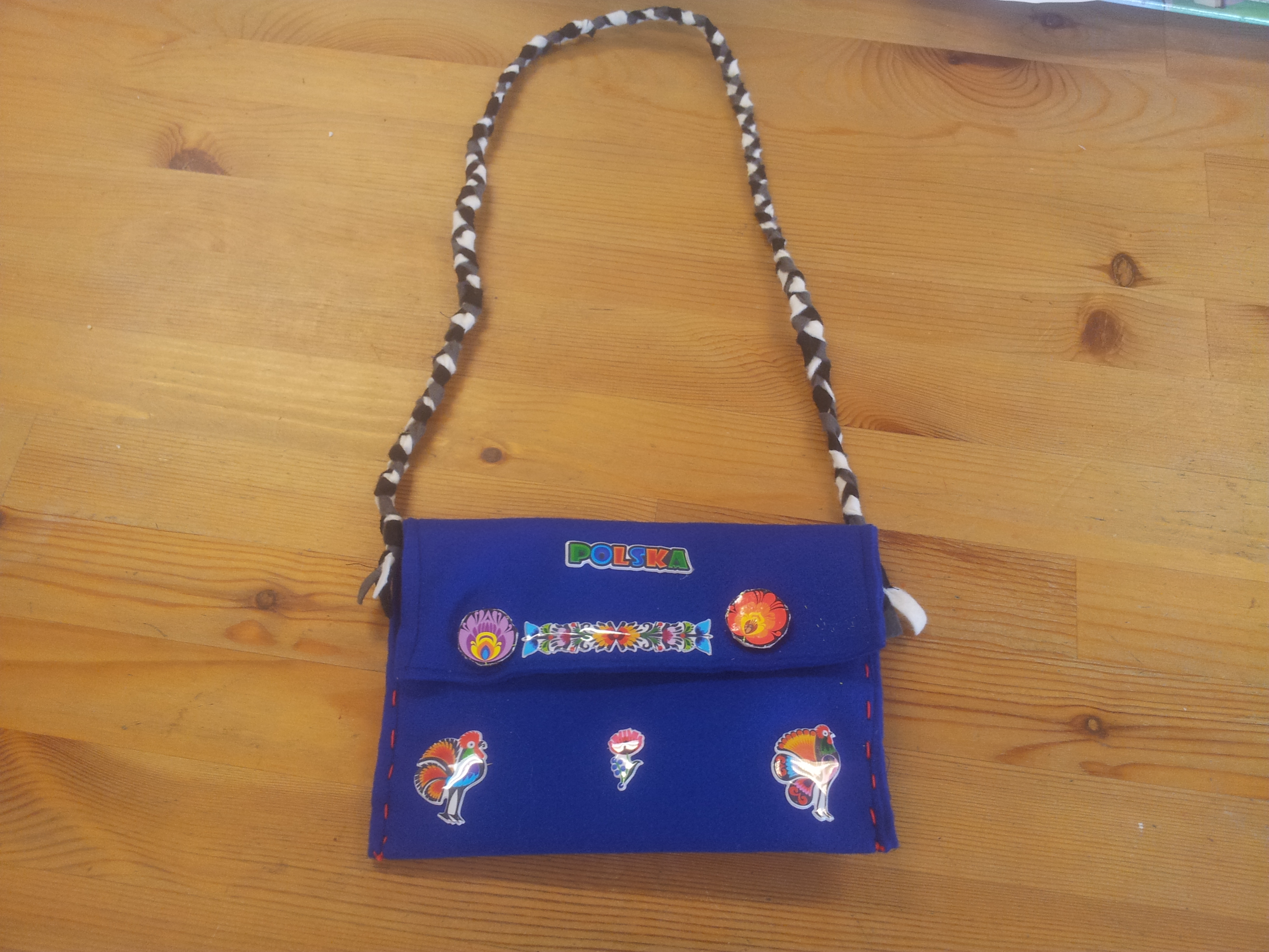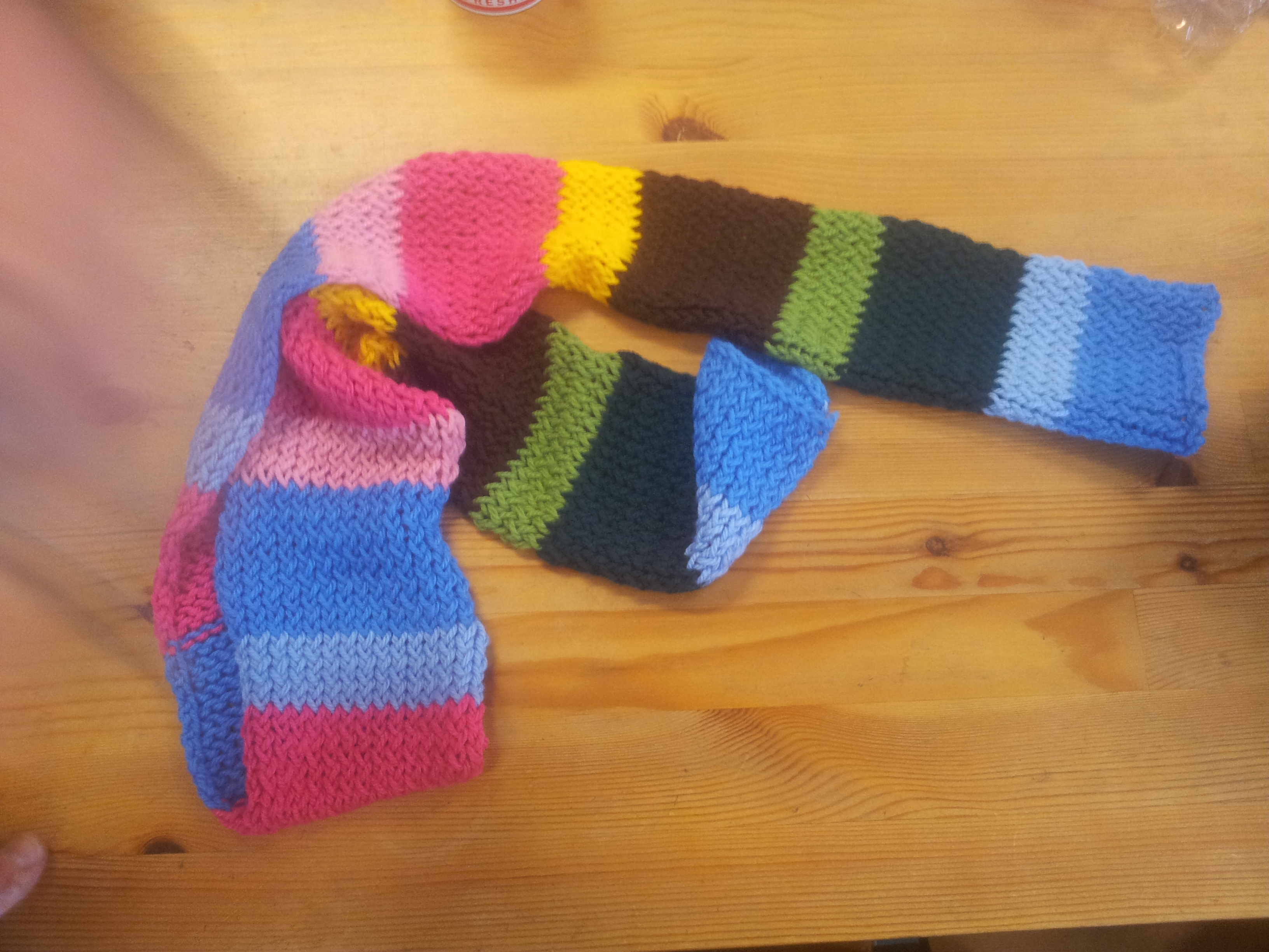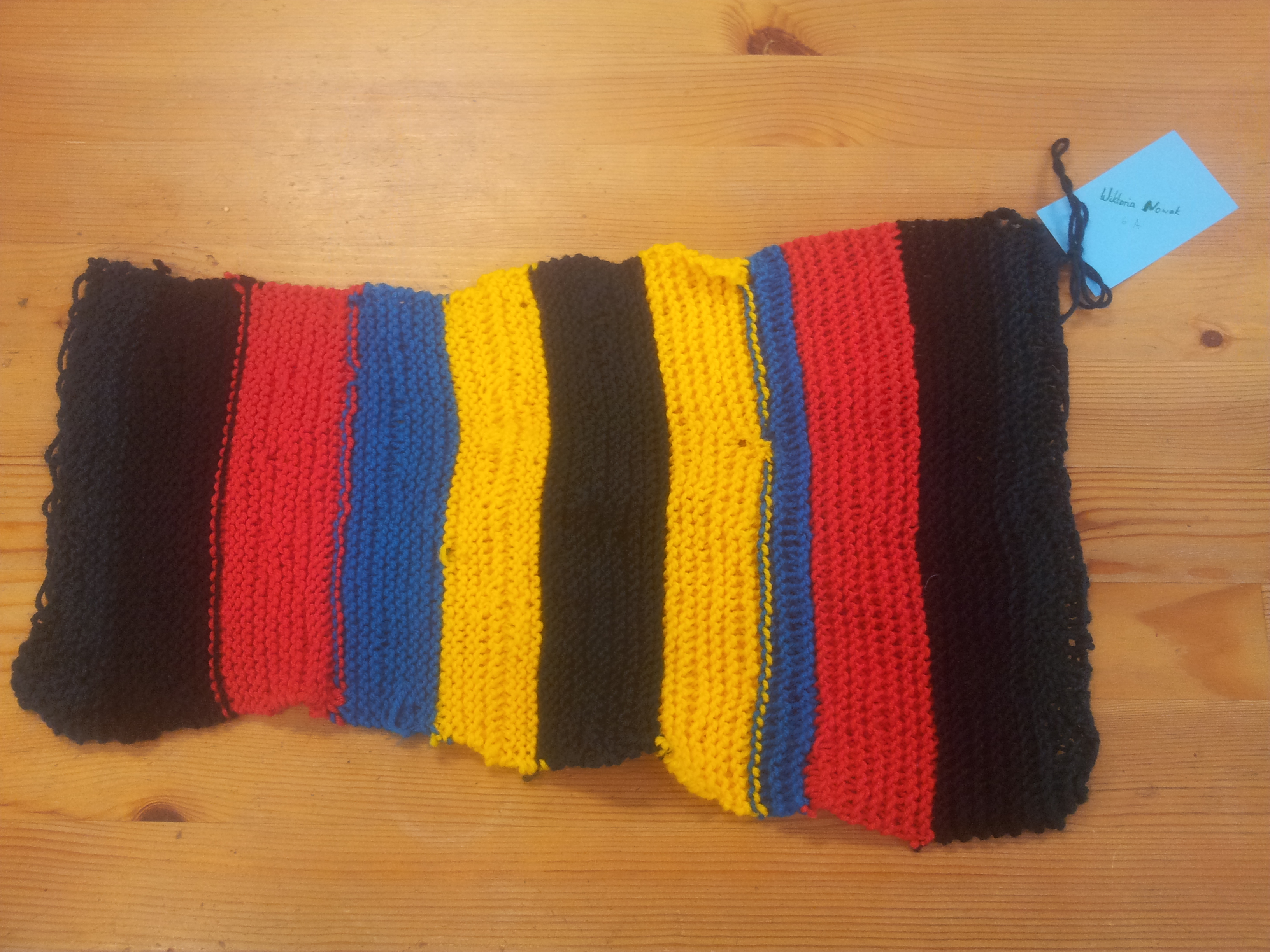 Charakterystycznym motywem stroju łowickiego jest pasiak, wełniana tkanina w różnokolorowe pasy. Spróbuj zrobić na drutach lub na szydełku szalik w łowickich barwach. Żeby można było wywiesić szalik na wystawie, musi być opakowany w folię.