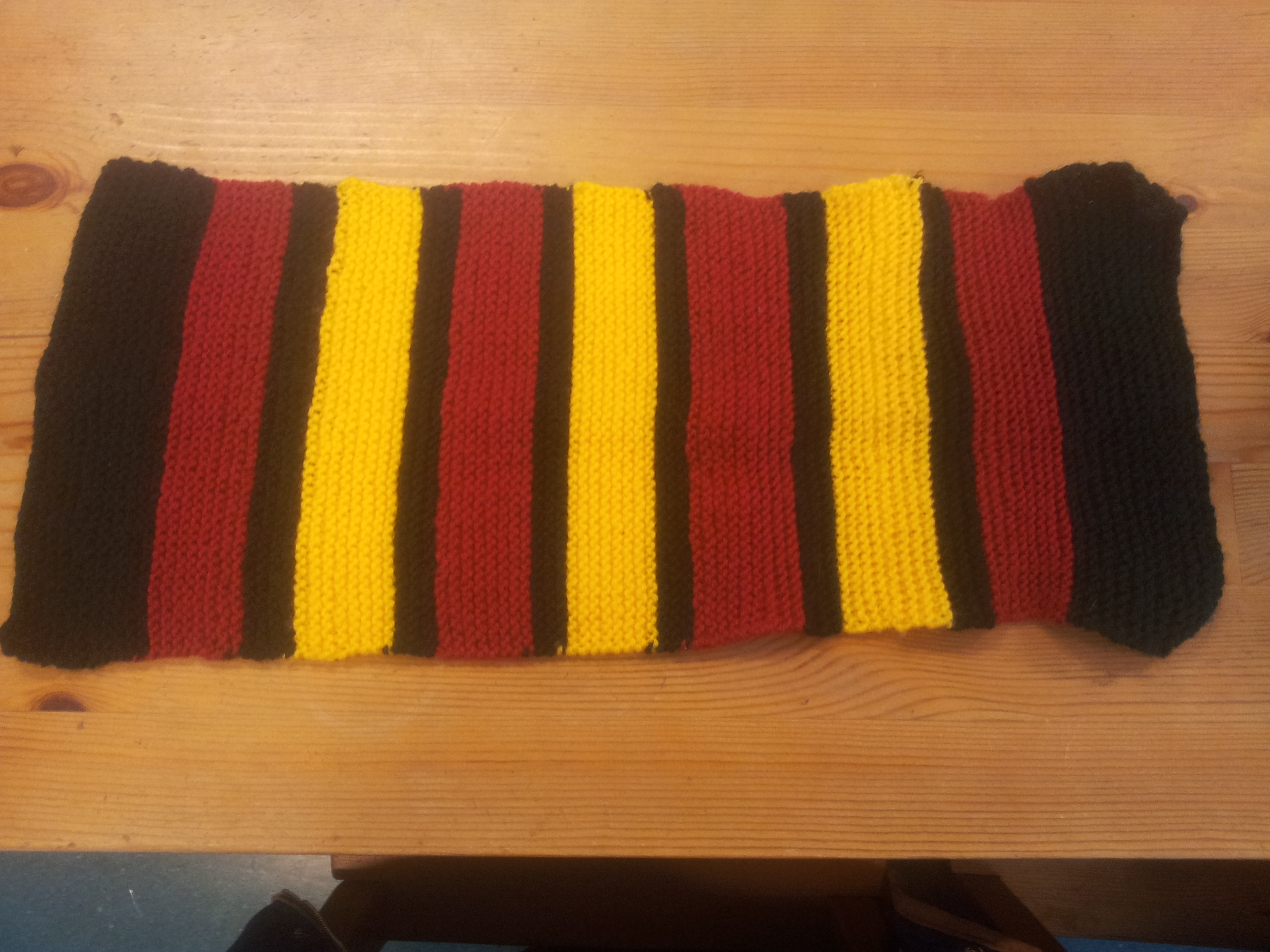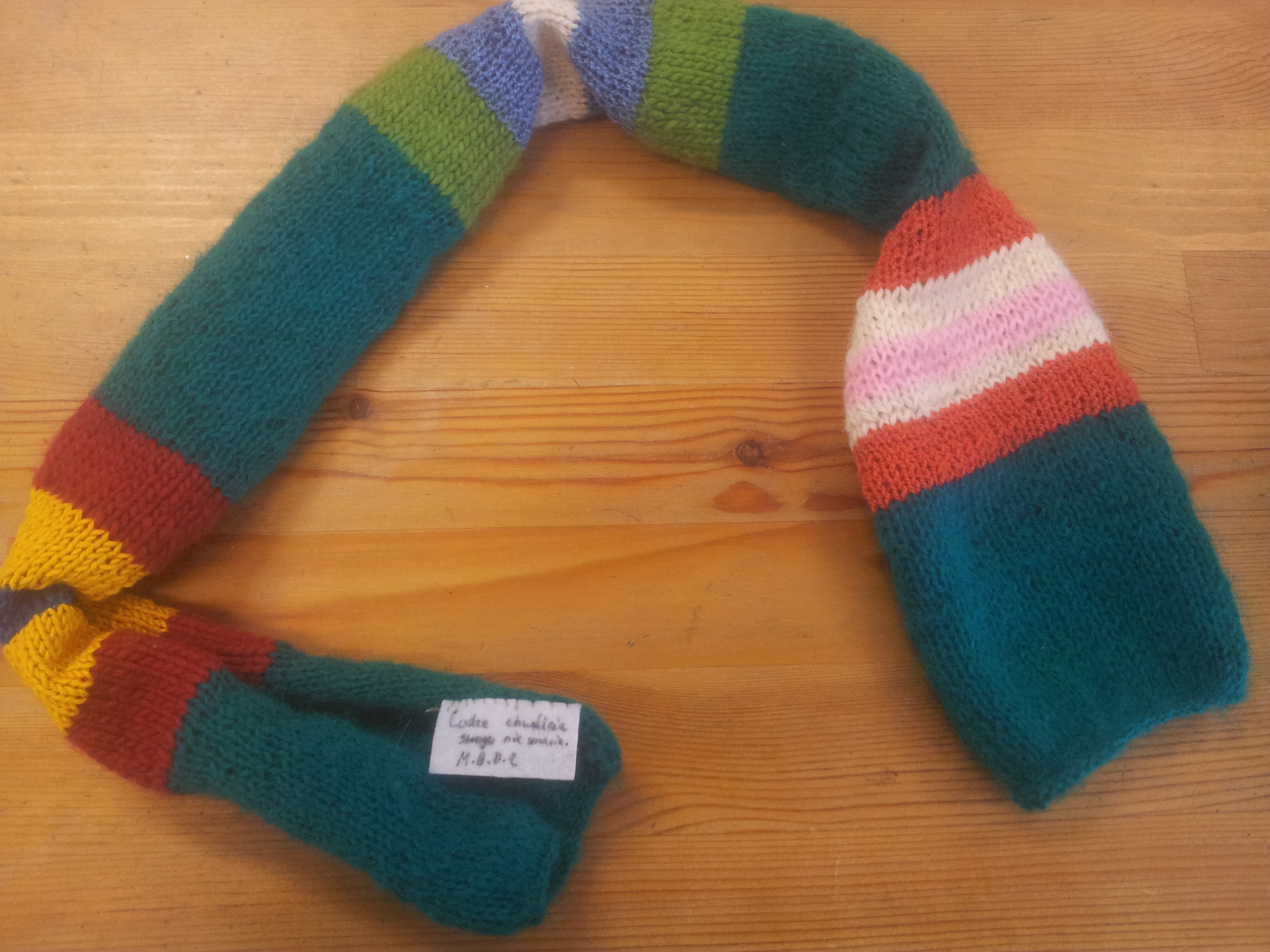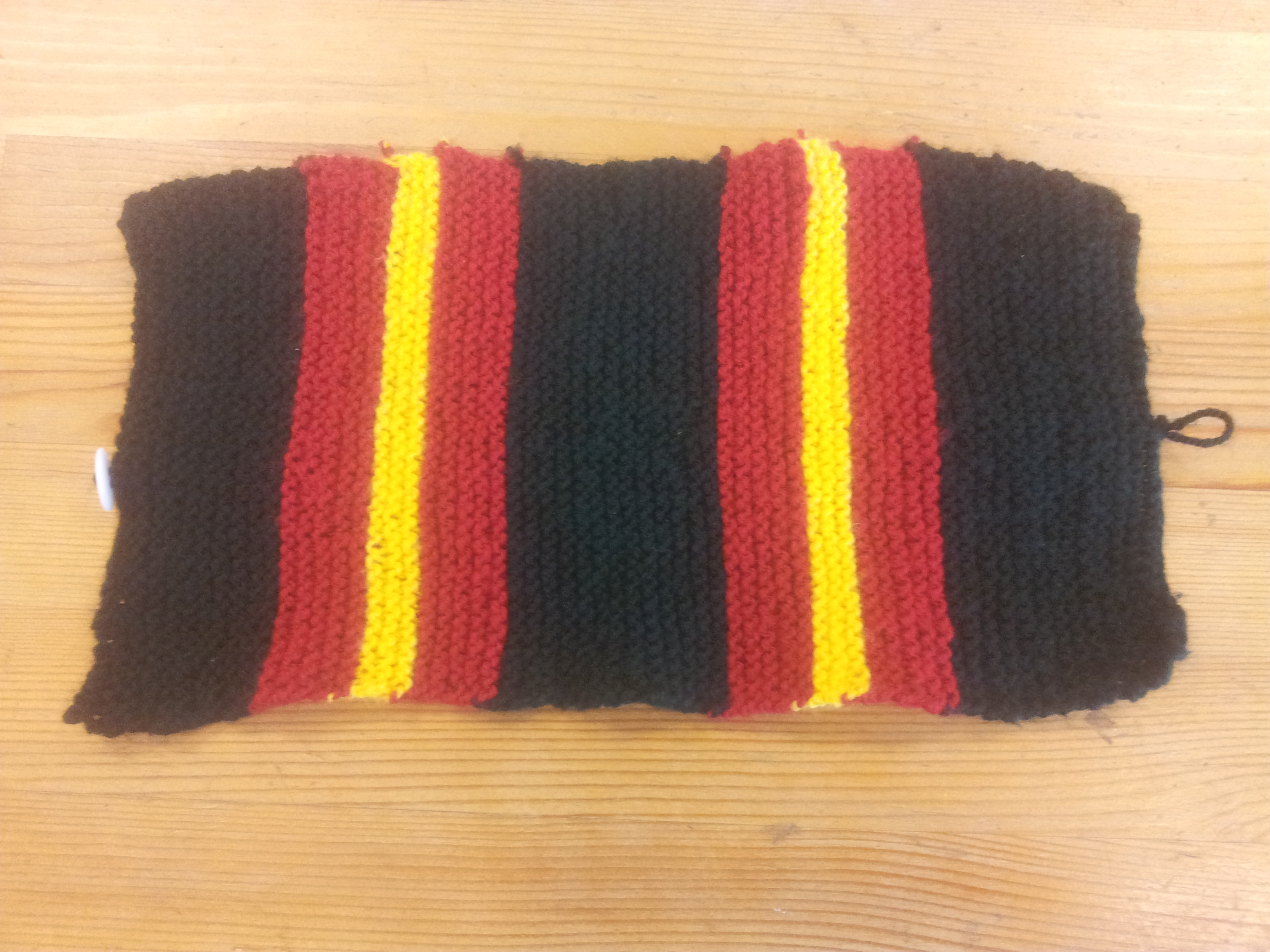 Charakterystycznym motywem stroju łowickiego jest pasiak, wełniana tkanina w różnokolorowe pasy. Spróbuj zrobić na drutach lub na szydełku szalik w łowickich barwach. Żeby można było wywiesić szalik na wystawie, musi być opakowany w folię.